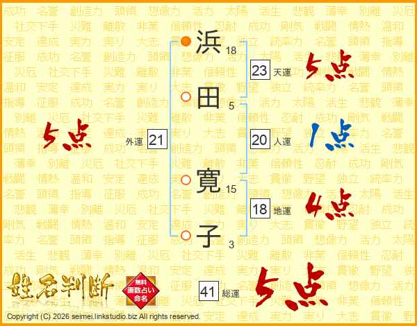 浜(18画)田(5画) 寛(15画)子(3画)