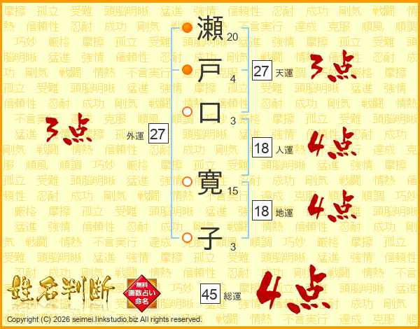 瀬(20画)戸(4画)口(3画) 寛(15画)子(3画)