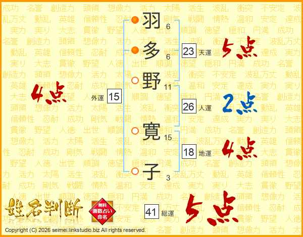 羽(6画)多(6画)野(11画) 寛(15画)子(3画)