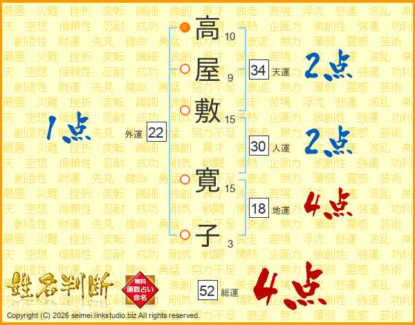 高(10画)屋(9画)敷(15画) 寛(15画)子(3画)
