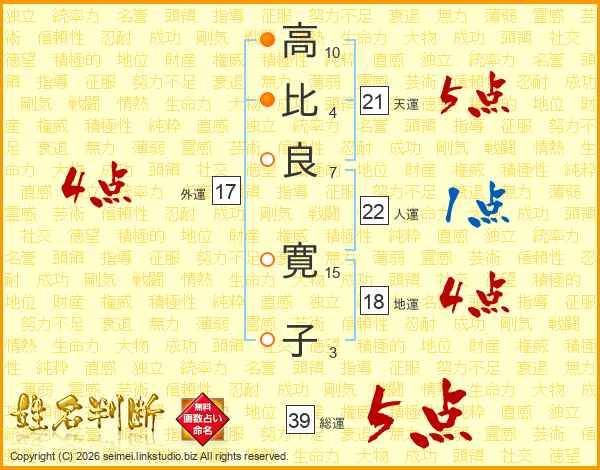 高(10画)比(4画)良(7画) 寛(15画)子(3画)