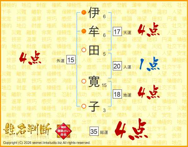 伊(6画)牟(6画)田(5画) 寛(15画)子(3画)