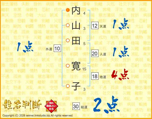 内(4画)山(3画)田(5画) 寛(15画)子(3画)