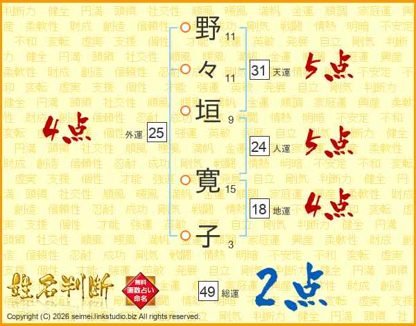 野(11画)々(11画)垣(9画) 寛(15画)子(3画)