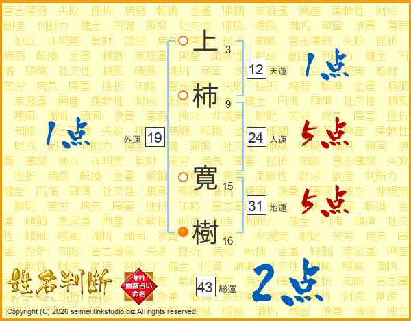 上(3画)柿(9画) 寛(15画)樹(16画)