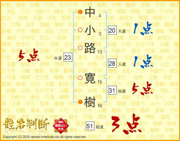 中(4画)小(3画)路(13画) 寛(15画)樹(16画)