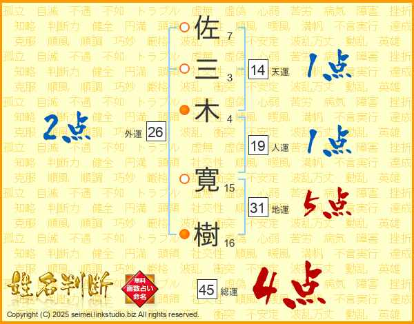 佐(7画)三(3画)木(4画) 寛(15画)樹(16画)