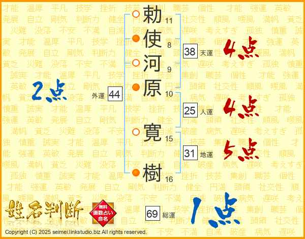 勅(11画)使(8画)河(9画)原(10画) 寛(15画)樹(16画)