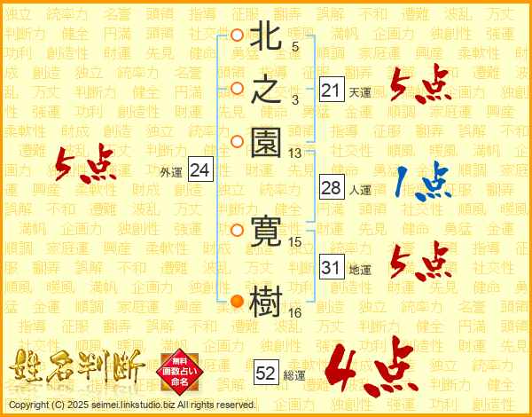 北(5画)之(3画)園(13画) 寛(15画)樹(16画)