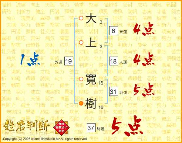 あなたの人生を表す1番重要な運勢です。生涯を通じて影響する総合運となり、主に50歳以降の晩年期に影響を及ぼします。苗字と名前の合計画数。