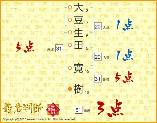 大(3画)豆(7画)生(5画)田(5画) 寛(15画)樹(16画)