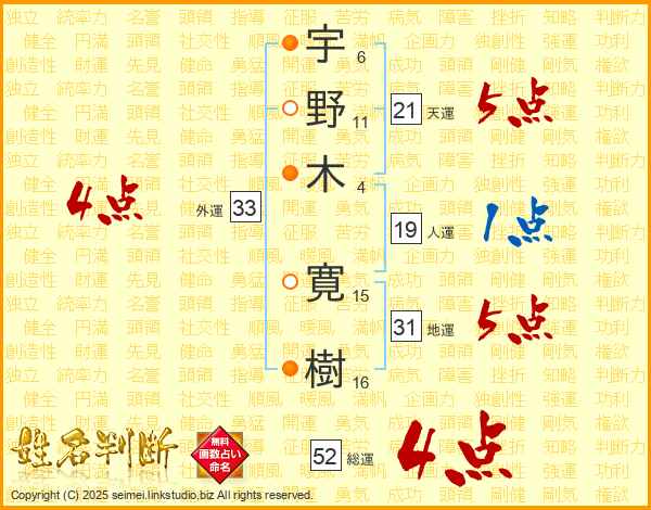 宇(6画)野(11画)木(4画) 寛(15画)樹(16画)