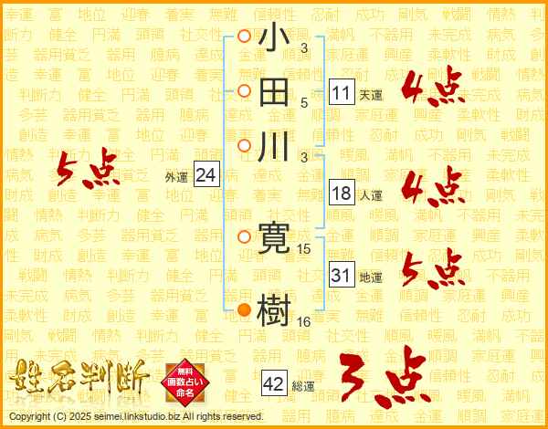 小(3画)田(5画)川(3画) 寛(15画)樹(16画)