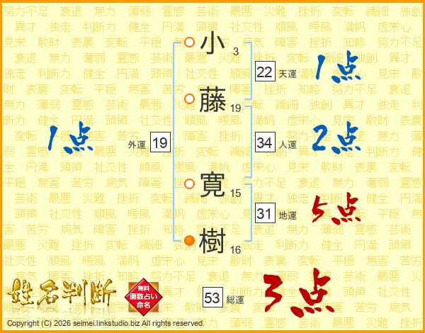 小(3画)藤(19画) 寛(15画)樹(16画)