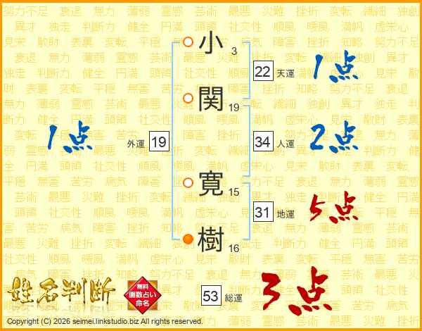 小(3画)関(19画) 寛(15画)樹(16画)