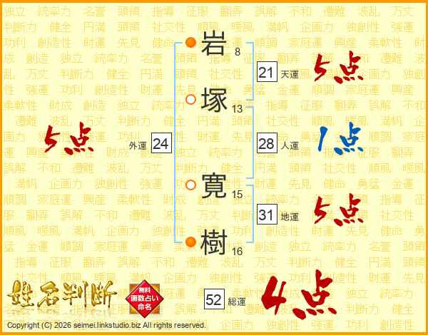 岩(8画)塚(13画) 寛(15画)樹(16画)