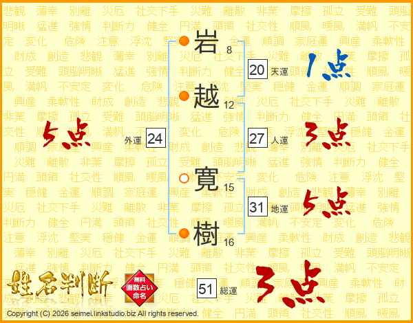 岩(8画)越(12画) 寛(15画)樹(16画)