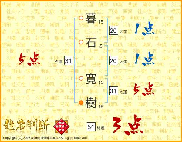 暮(15画)石(5画) 寛(15画)樹(16画)