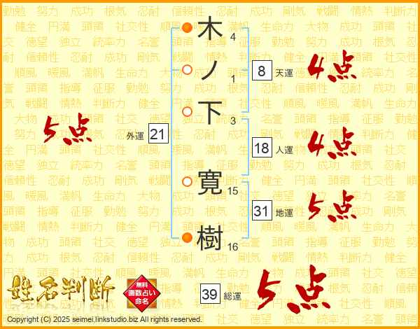 木(4画)ノ(1画)下(3画) 寛(15画)樹(16画)