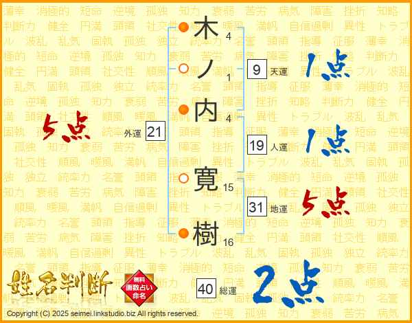 木(4画)ノ(1画)内(4画) 寛(15画)樹(16画)