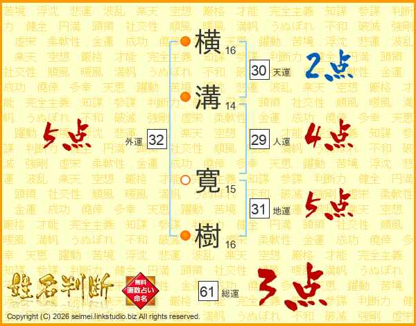 横(16画)溝(14画) 寛(15画)樹(16画)