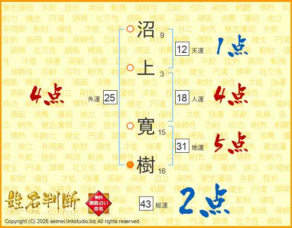 沼(9画)上(3画) 寛(15画)樹(16画)