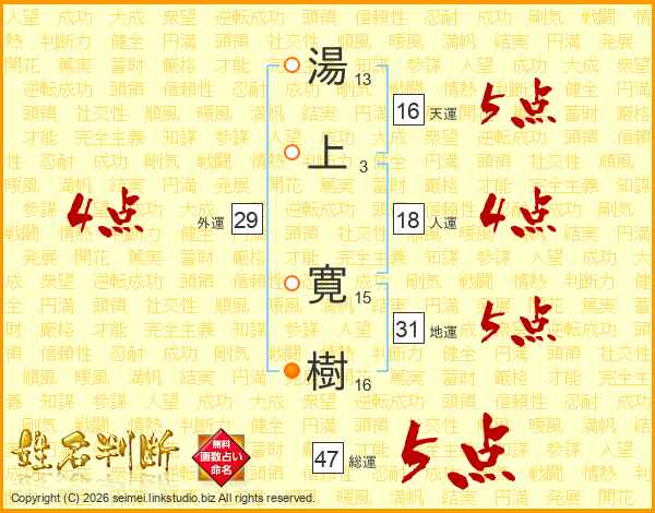 湯(13画)上(3画) 寛(15画)樹(16画)