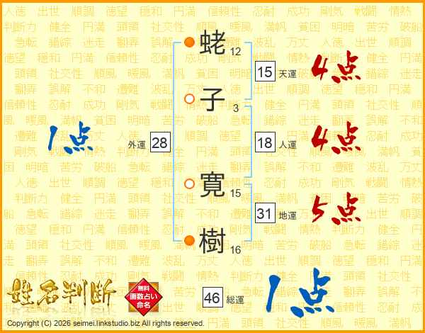 蛯(12画)子(3画) 寛(15画)樹(16画)