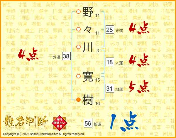 野(11画)々(11画)川(3画) 寛(15画)樹(16画)