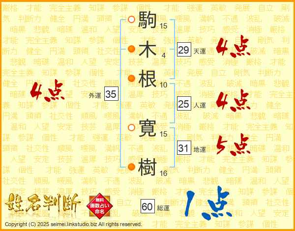 駒(15画)木(4画)根(10画) 寛(15画)樹(16画)