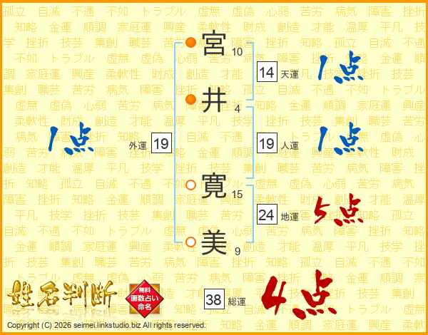宮(10画)井(4画) 寛(15画)美(9画)