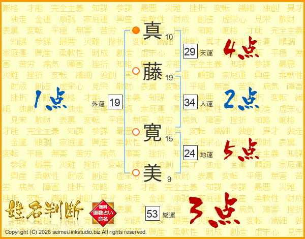 あなたの人生を表す1番重要な運勢です。生涯を通じて影響する総合運となり、主に50歳以降の晩年期に影響を及ぼします。苗字と名前の合計画数。