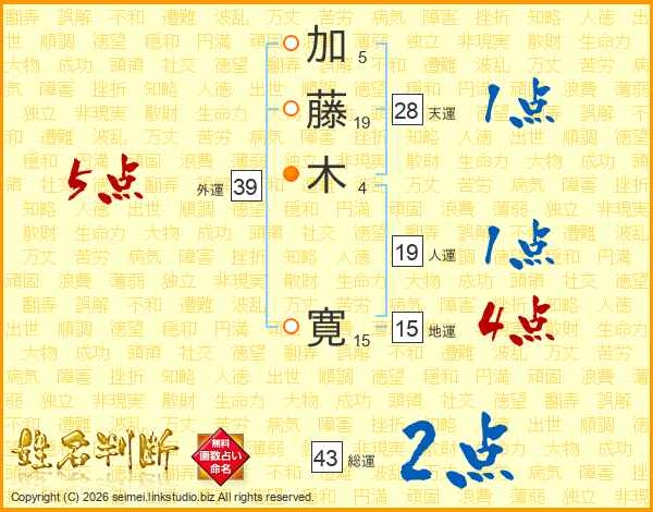 加(5画)藤(19画)木(4画) 寛(15画)