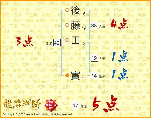 生活面を象徴する運勢です。外部から受ける影響力を表し、結婚運、家庭運や職場、環境への順応性を表します。総運から人運を引いた画数。姓や名が1文字の場合を除く。