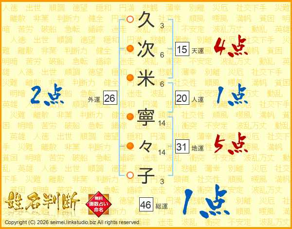 久(3画)次(6画)米(6画) 寧(14画)々(14画)子(3画)