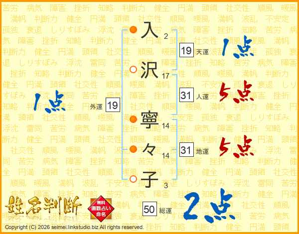 入(2画)沢(17画) 寧(14画)々(14画)子(3画)