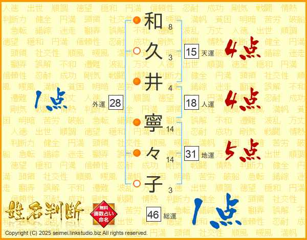 和(8画)久(3画)井(4画) 寧(14画)々(14画)子(3画)