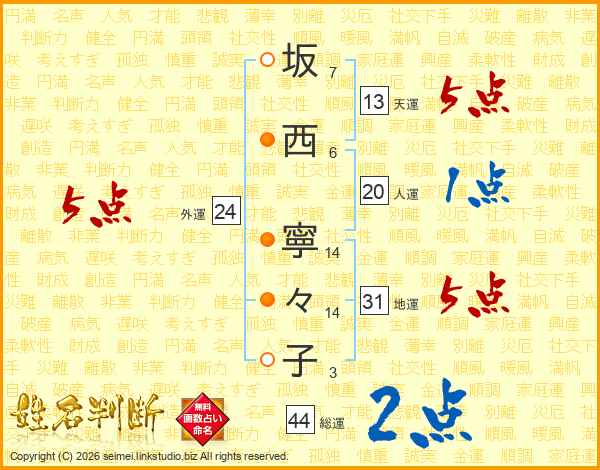 坂(7画)西(6画) 寧(14画)々(14画)子(3画)