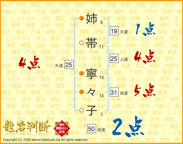 姉(8画)帯(11画) 寧(14画)々(14画)子(3画)