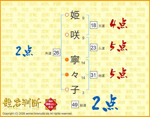 姫(9画)咲(9画) 寧(14画)々(14画)子(3画)