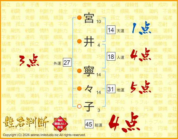 宮井寧々子さんの総運は45画の4点!