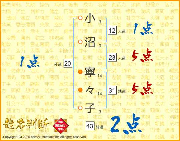 小(3画)沼(9画) 寧(14画)々(14画)子(3画)