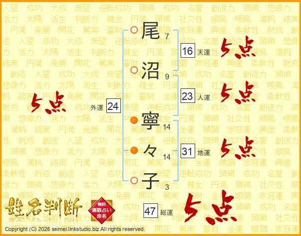 尾(7画)沼(9画) 寧(14画)々(14画)子(3画)