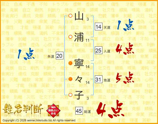 山(3画)浦(11画) 寧(14画)々(14画)子(3画)