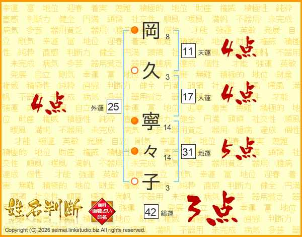 岡(8画)久(3画) 寧(14画)々(14画)子(3画)