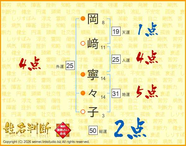 岡(8画)﨑(11画) 寧(14画)々(14画)子(3画)