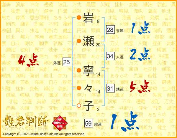 岩(8画)瀬(20画) 寧(14画)々(14画)子(3画)