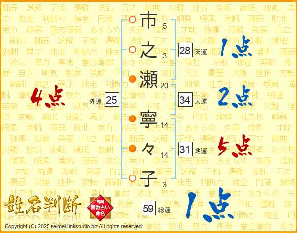 市(5画)之(3画)瀬(20画) 寧(14画)々(14画)子(3画)