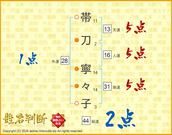 帯刀寧々子さんの総運は44画の2点!