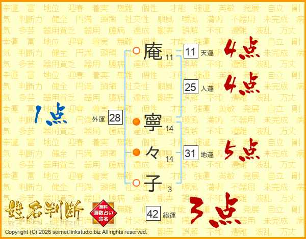 庵(11画) 寧(14画)々(14画)子(3画)